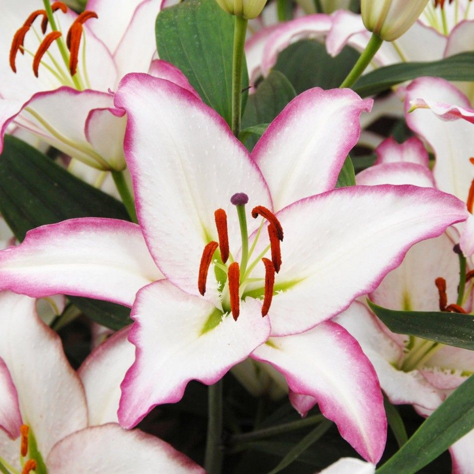 Лилия Hotline, также известная как "Горячая линия", представляет собой великолепный восточный гибрид, который станет настоящим украшением вашего сада. Этот сорт отличается крупными, яркими цветами с насыщенными розовыми лепестками, которые плавно переходят в белоснежные края. В центре каждого цветка расположены контрастные темные пятна, придающие растению особую выразительность.