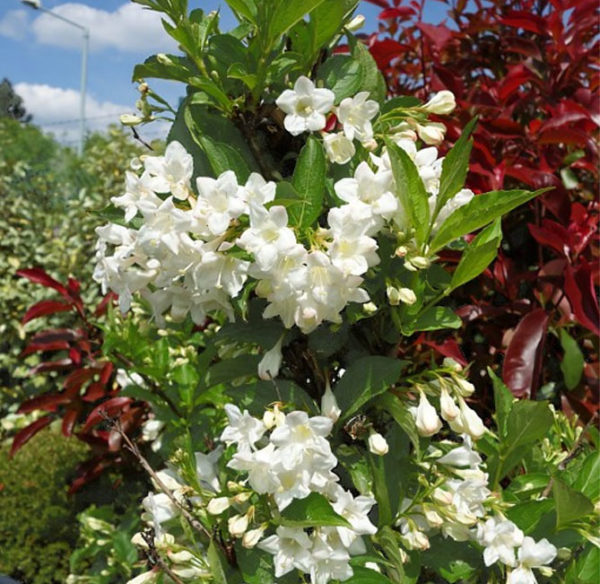 Вейгела гибридная "Бристол Сноуфлейк" (Bristol Snowflake) – это изысканный кустарник, который станет настоящим украшением вашего сада. Этот сорт отличается обильным цветением и нежными белыми цветками, которые создают эффект снежного покрова на фоне зелёной листвы.